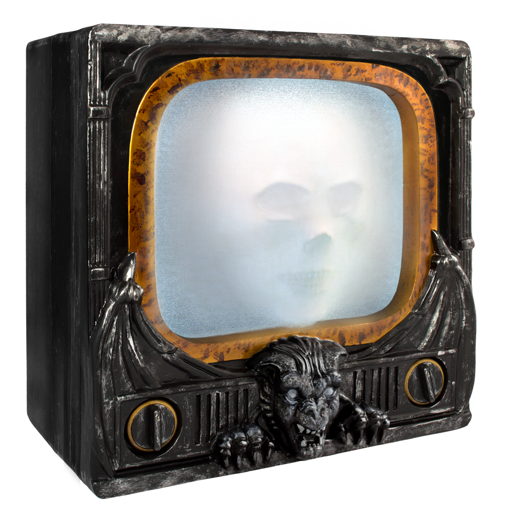 Tune in to Terror! When Activated, This Gothic Television Lights Up and Flickers with Static Sounds as a Terrifying Poltergeist Emerges From the Screen.